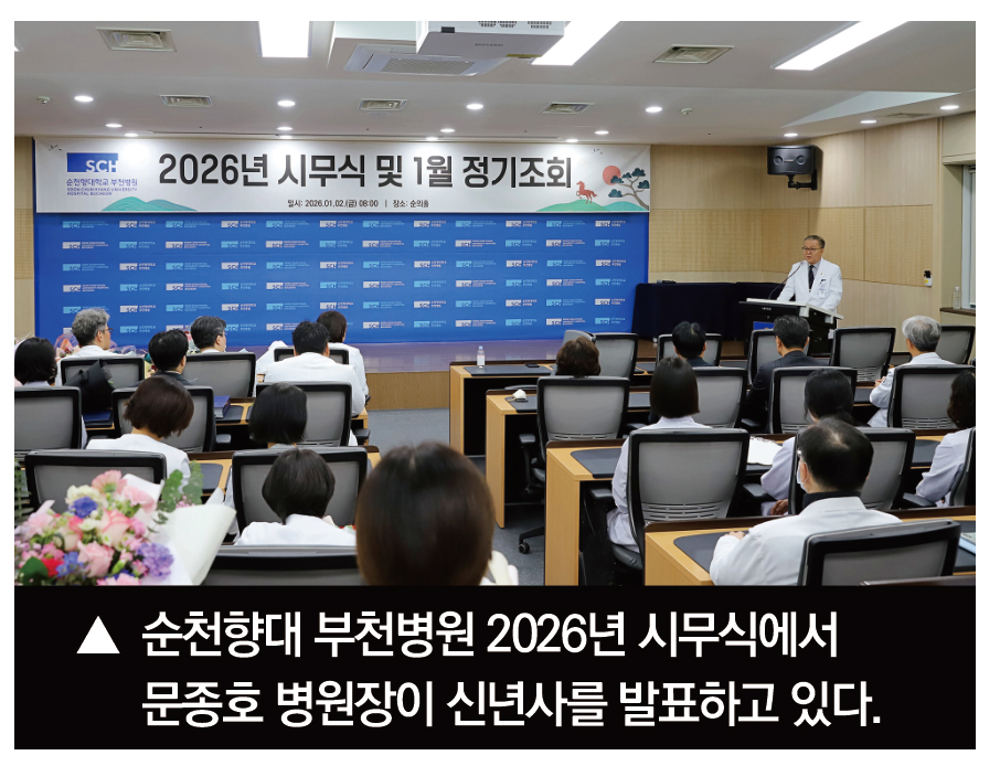 순천향대 부천병원(병원장 문종호)이 2일 순의홀에서 2026년 병오년(丙午年) 시무식을 열고, 중증‧필수 의료 역량을 강화해 병원 경쟁력을 한층 높이겠다는 의지를 밝혔다.