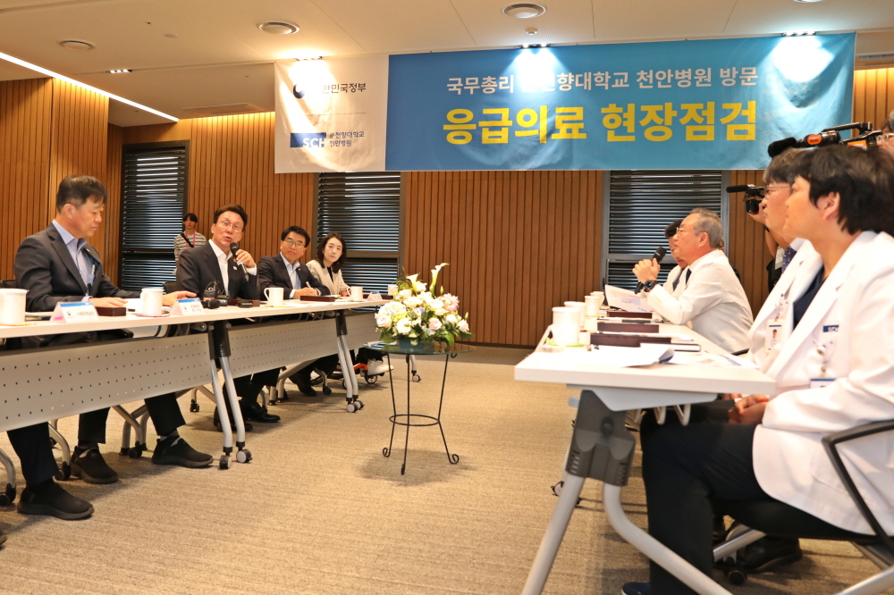 김 총리는 순천향대천안병원 6층 제1강당에서 의료진 의견 청취 후, 충남권역응급의료센터와 소아전문응급의료센터를 방문해 응급의료 운영상황을 점검했다.