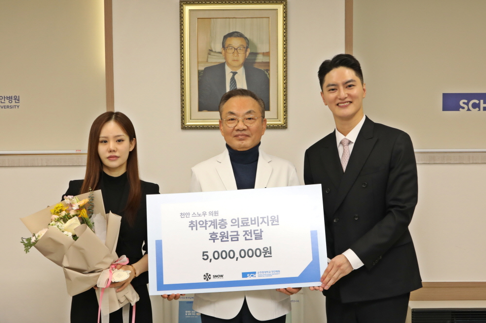 천안스노우의원(대표원장 윤석진)이 순천향대학교 부속 천안병원(병원장 이문수)에 지역 취약계층 환자를 위한 의료비 지원금 500만 원을 후원했다.