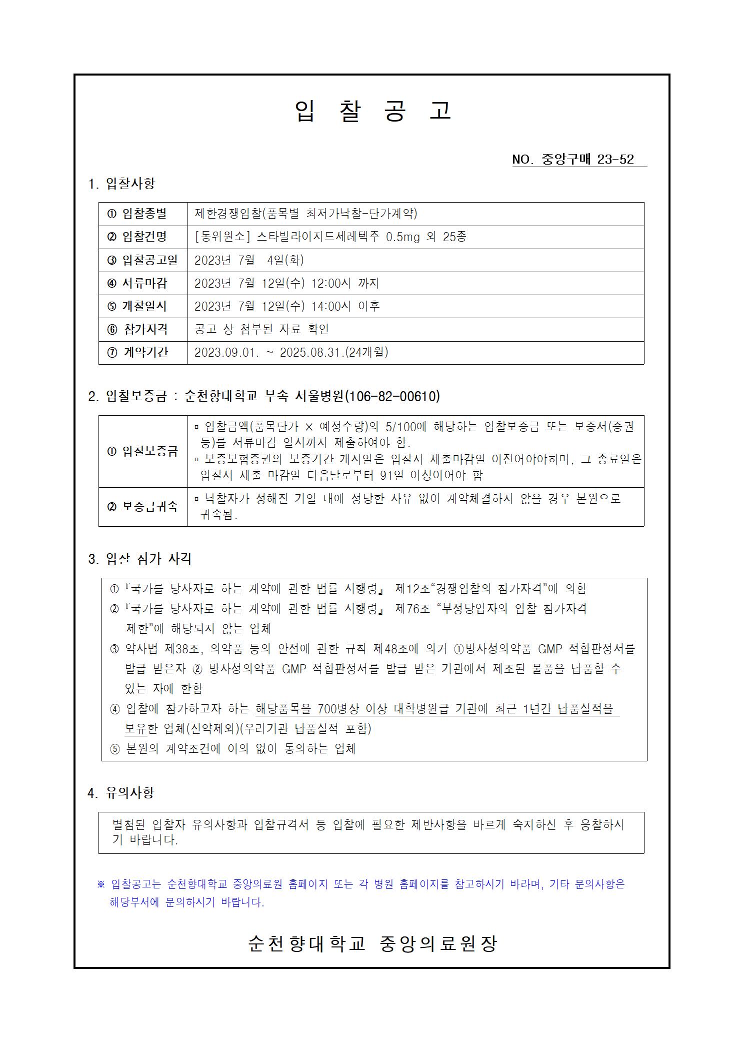 이전 순천향대학교 부속 서울병원 마약 공급업체 입찰공고문 2023.07.04