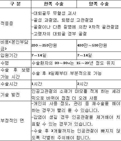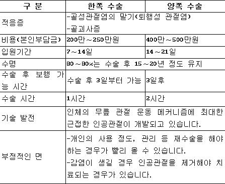 양쪽 동시 수술의 경우 경비는 절약되지만 재활이 늦고 한쪽씩 하면 경비·시간 이 늘어나지만 재활은 짧아 장단점을 각각 갖고 있습니다. 다른 치료법이 없는 환자에게 인공관절은 마지막 대안이 될 수 있습니다. 하지만 값이 수백만원대에 이르는 것이 큰 단점입니다. 원칙적으로 수술 대상은 65세 전후로 잡습니다. 무릎 인공관절 수술은 양쪽을 한꺼번에 할 수도 있고, 나눠서 할 수도 있습니다. 따로 수술할 경우 한쪽을 한 뒤 2주일 후에는 가능합니다. 양쪽을 동시에 할 경우 수술을 한번 받는다는 장점 외에도 경비와 시간이 절약되지만, 재활이 좀 늦어질 수 있습니다. 반면, 나눠서 수술 받으면 심리적 불안감이 많고, 경비와 시간이 늘어나는 단점이 있지만, 재활시간은 짧습니다. 임원은 대개 수술 4∼5일 전에 한다. 무릎(슬관절)과 엉덩이뼈(고관절) 인공관절 수술의 비용, 시간 등은 대개 다음과 같습니다.