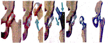 ◇엉덩이관절에 시행하는 인공관절 수술 과정, 대퇴골두(대퇴골 머리)에 혈액이 통하지 않아 생긴 무혈성 괴사, 그로 인해 납작해진 대퇴골두를 잘라내고 인공관절 봉을 그 안에 끼우고, 관절면에는 인공관절 소켓을 붙인다. 이후 인공관절 봉에 볼을 끼운후 관절면에 맞춰준다.