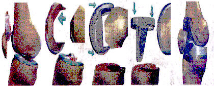 ◇무릎 관절에 시행하는 인공관절 수술 과정, 퇴행성 관절염 등으로 연골이 닮은 대퇴골 하단을 잘라낸다. 이후 금속으로 된 관절면을 붙이고, 정강이뼈(경골) 상단도 잘라낸다. 정강이뼈 상단에 관절판을 넣고 대퇴골의 인공관절면과 맞추어 준다.