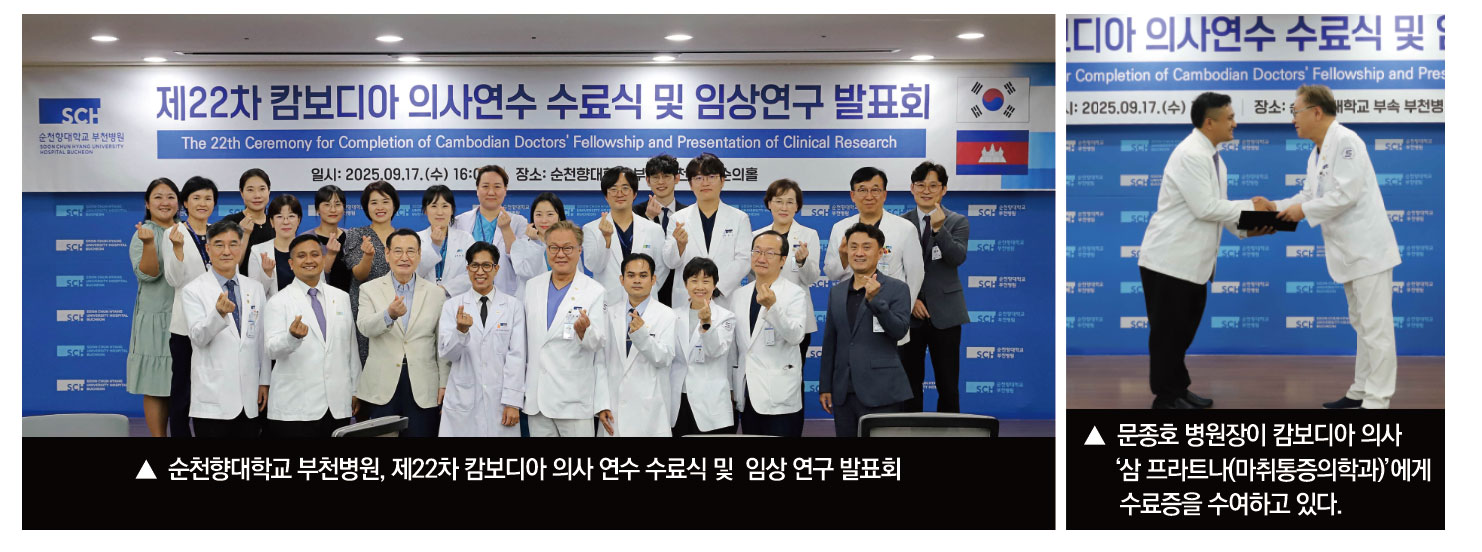 문종호 병원장은 “올해 수료생 3명을 포함해 지난 22년간 총 71명의 캄보디아 의사가 우리 병원에서 연수를 성공적으로 마쳤다”며 “이들이 한국에서 배운 선진 의술과 순천향의 ‘인간사랑’ 정신을 캄보디아 현지에 전파하고 있다”고 말했다. 이어 “앞으로도 캄보디아 의사들이 한국의 의술을 배우고 돌아가 현지 의학 발전에 이바지할 수 있도록 지원을 아끼지 않겠다”고 덧붙였다.