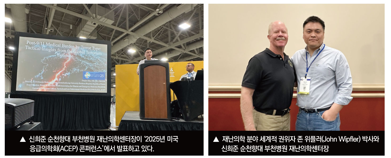 신 센터장은 최근 미국 유타주 솔트레이크시티에서 열린 ‘2025년 미국 응급의학회(ACEP) 콘퍼런스’에 참석해 ‘9.11 테러 이후, 테러 유형별 의료 부담: 세계 테러리즘 데이터베이스에 따른 전술적 통찰’ 등 3건의 구연 발표와 1건의 포스터 논문을 발표하며 학문적 성과를 공유했다.