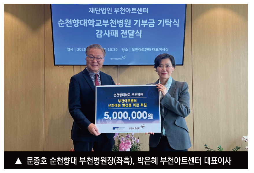 기탁식에서 박은혜 대표이사는 “부천시를 대표하는 의료기관인 순천향대학교 부천병원의 따뜻한 나눔에 진심으로 감사드린다”며, “소중한 기부금은 지역 문화예술 발전과 시민의 문화 향유 확대를 위해 의미 있게 사용하겠다”고 전했다.