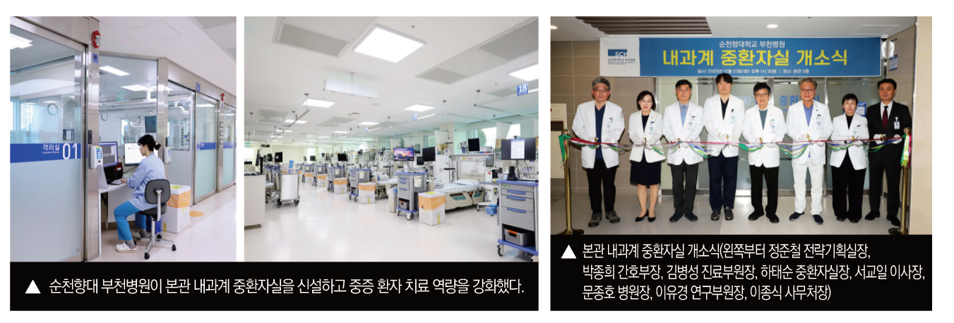 이번 중환자실 신설로 순천향대 부천병원의 중환자 병상은 본관 내과계 중환자실 25병상을 포함해 본관 외과계 중환자실 19병상, 응급 중환자실 20병상, 별관 중환자실 20병상, 신생아 중환자실 24병상 등 총 108병상으로 확대됐다. 각 중환자실은 전담전문의가 환자 상태를 상시 관리하는 체계를 갖춰 중증 환자의 특성에 맞춘 신속한 치료가 가능하다.