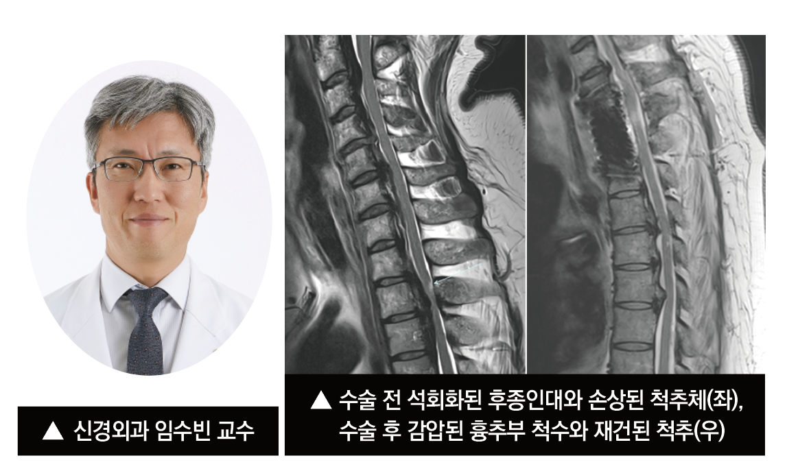 A씨의 경우 흉추 2·3번 부위에 후종인대골화증이 발생해 수술 부위가 깊고 석회화가 심해 수술 난이도가 매우 높을 것으로 예상됐다. 임 교수는 그간 40여 건의 흉골병경유 전방접근술(Tranmanubrial approach) 경험을 바탕으로, 심장에서 나오는 대혈관을 더 효과적으로 견인할 수 있는 장치까지 새로 마련하며 철저히 준비했다. 수술은 석회화된 후종인대와 손상된 척추체를 안전하게 제거한 뒤, 임 교수가 직접 고안한 척추용 케이지를 삽입해 절제 부위를 재건·보강했다. 환자는 수술 다음 날부터 하지 기능이 빠르게 회복돼 보조기 없이 보행할 수 있을 정도로 호전됐다.