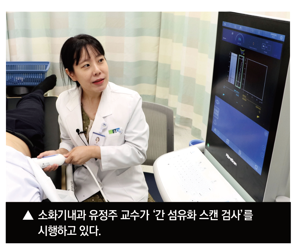 유정주 소화기내과 교수는 “간 섬유화 스캔 검사는 통증과 부작용 위험 없이 간 섬유화 정도를 정량화할 수 있는 획기적인 검사다. 최근에는 간경변, 지방간, 간염 등 다양한 간질환 평가에 필수적으로 활용하고 있다”며, “간경변증이 한번 진행되면 정상 간 상태로 완전히 회복되기 어려우므로 조기 진단과 적극적인 관리로 간 기능 손상과 합병증을 예방하는 것이 무엇보다 중요하다”고 말했다.