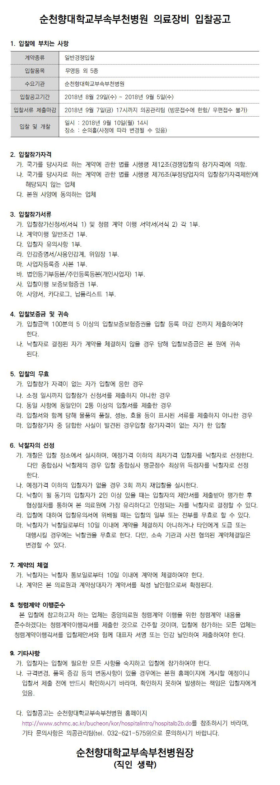이전 2018년도 순천향대학교 부속 부천병원 동위원소 연간구매계약 입찰 공고(재공고) 2018.08.21