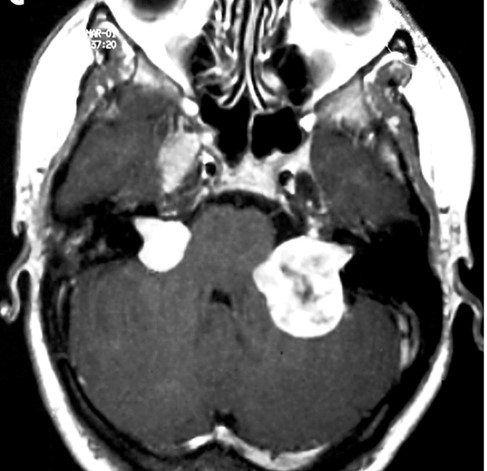 양측 청신경종양을 가진 2형 신경섬유종의 대표 뇌 MRI(자기공명영상)