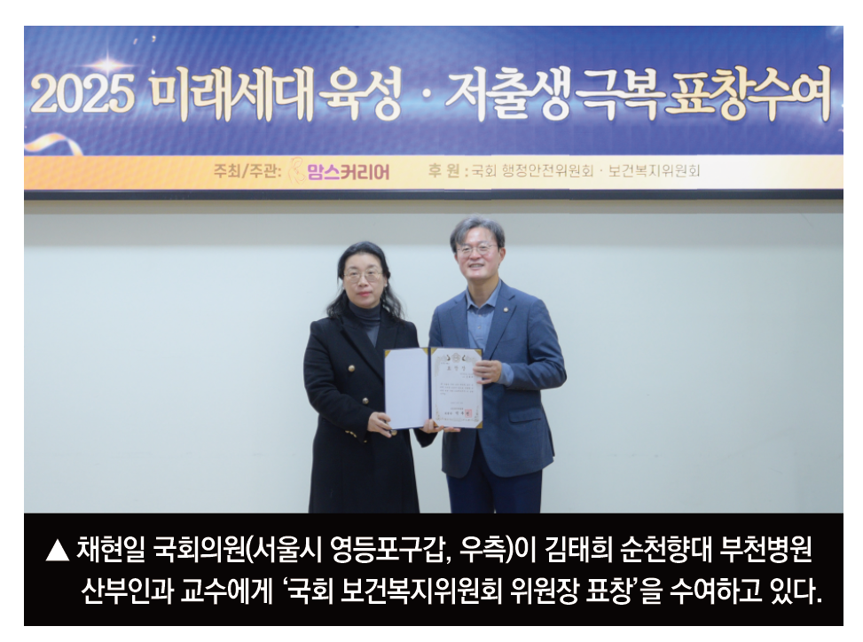 김태희 순천향대 부천병원 산부인과 교수가 저출생 및 인구 절벽 문제 해결에 기여한 공로를 인정받아 ‘국회 보건복지위원회 위원장 표창’을 받았다고 3일 밝혔다.