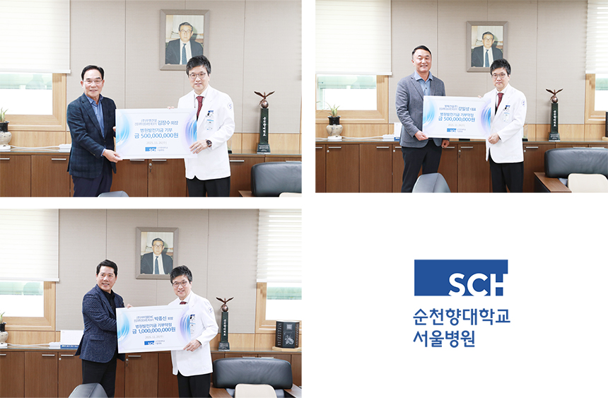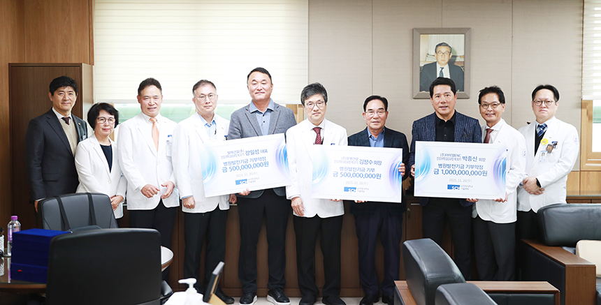 아이엘ENC 박종신 회장, 발해건설 강일성 대표는 병원을 찾아 발전기금 각 10억원 기부 약정 및 1억원 기부, 5억원을 기부 약정했다. 박종신 회장은 건강과학CEO과정 30기, 강일성 발해건설 대표는 건강과학CEO과정 37기이다. 우영건설 김장수 회장은 건강과학CEO과정 37기로 발전기금 총 5억원을 기부했다. 기부금은 병원의 지속 가능한 발전을 위해 사용될 예정입니다.